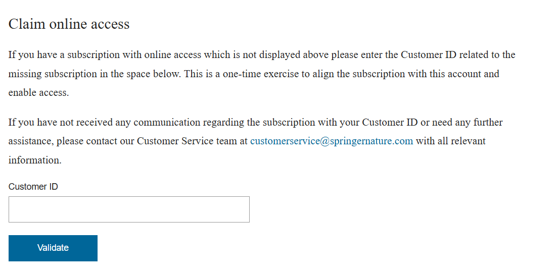 オンラインで購読を申し込まれた場合、お客様の Customer ID は自動的にお客様の nature.com のaccount に割り当てられます。購読コンテンツにアクセスするには、ご注文の際に使用したものと同じEメールアドレスとパスワードでログインしてください。